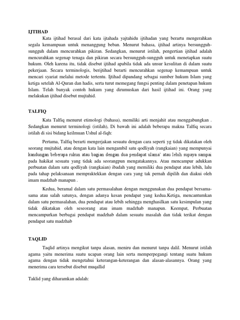 Makalah Ittiba Talfiq taqlid dan Tarjih. Sumber hukum dalam islam ada yang disepakati muttafaq para ulama dan. Ijtihad Madzhab Taqlid dan Talfiq.